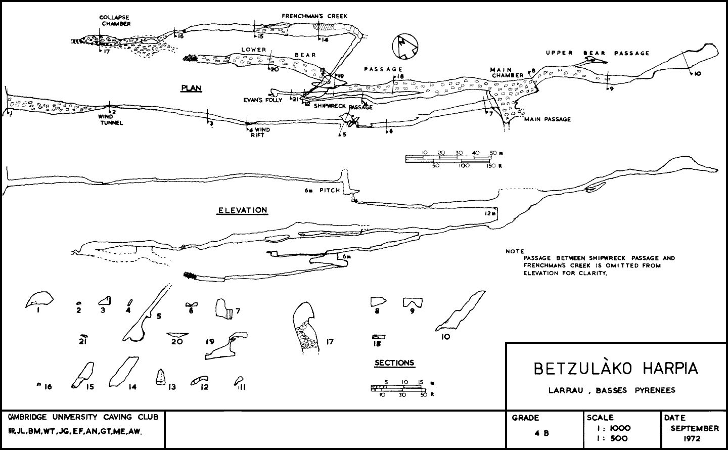The next night a party of Bob Mathews, Julian Griffiths and William Taylor, exalted by the discovery of the Café in Lique, slid down the slope to attempt to finish surveying the downstream passages. It was noticeable that none of the previous party were keen to repeat the climb down to the cave. Mistaking a passage leading off Lower Bear for Evan's Folly, the party surveyed Shipwreck Passage. Their mistake was obvious when the passage ended and a small crawl went off to the right. William pushed on and came back with news of caverns of unparalleled splendour, so deciding to finish the survey first and then return to explore, they returned to Lower Bear and surveyed that and Evan's Folly. Unfortunately William started to suffer from his efforts in CUCC 4 and so the party returned to meet the dawn and await the Land Rover. Much later it arrived with the rest of the club who had been trying to repeat last year's effort and be arrested again.