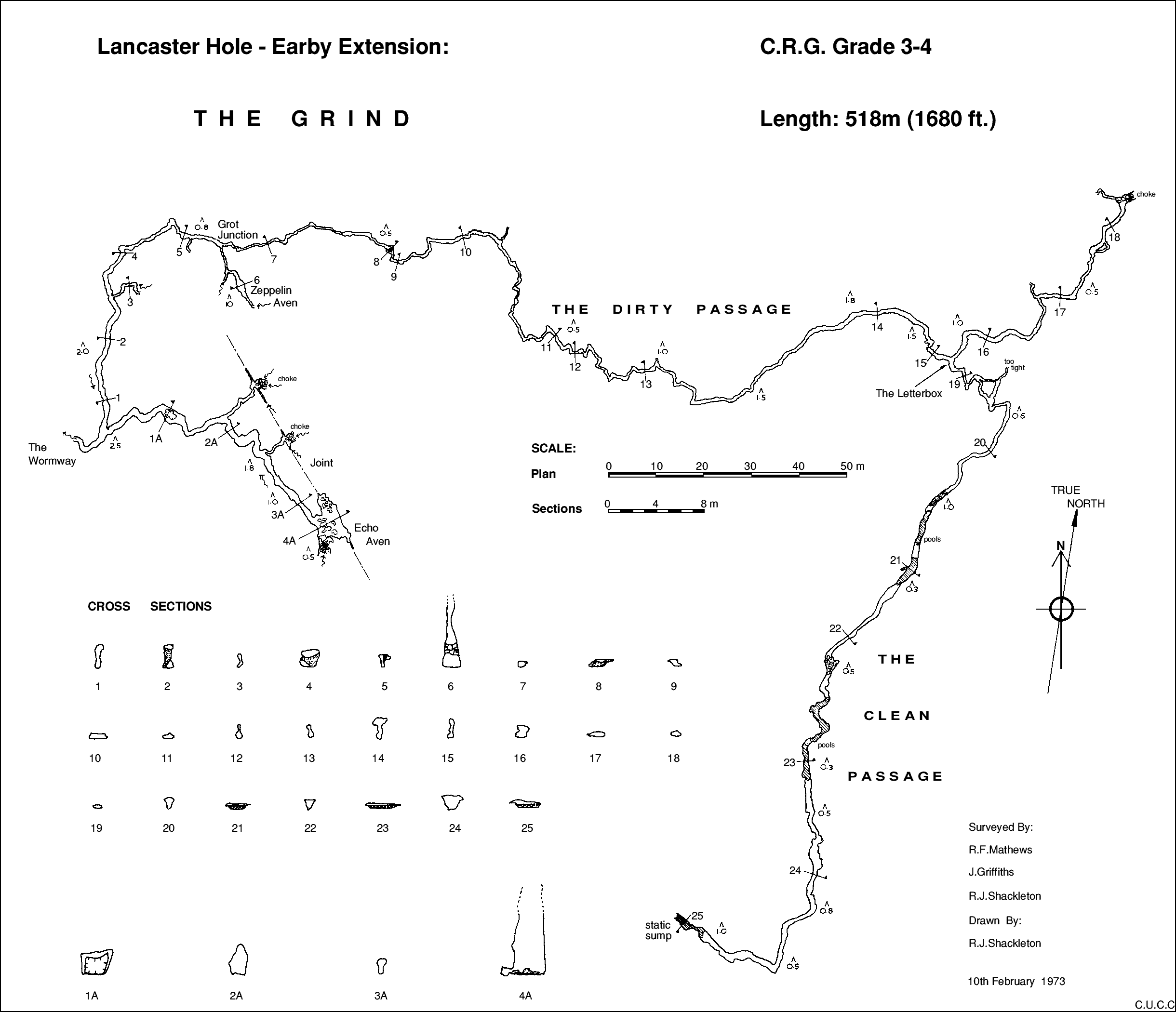 The obvious place to start the investigation was the Grind, a small muddy passage leading off from the Wormway about 60m before its termination at Echo Aven. The Grind was the only major portion of the whole extension which remained unsurveyed and it had not been pushed to a conclusion by the Earby in their initial explorations in 1971. It was on January 9th 1973 that Julian Griffiths and myself decided to have a good look at the passage, and to survey as much of it as possible in the time available. Surveying in the Grind is indeed a difficult task because of its awkward, constricted nature and its glutinous mud. It was rapidly found that the instruments became totally jammed up with filth, and so the surveying was shelved until a later date, when more man power would be available. However, two important things were achieved on this trip. The main passage was pushed to a conclusion, a static sump, and it was realised that, in its later stages, the passage could possibly be situated beneath Leck Fell and not Casterton, having passed beneath Easegill beck at some point along its length. This was later found to be true, and represents an interesting breakthrough in actual knowledge (as opposed to theory) of the hydrology of the Leck-Casterton cave systems; since the passage must have, at some time in the past, drained into the Leck Fell cave system.